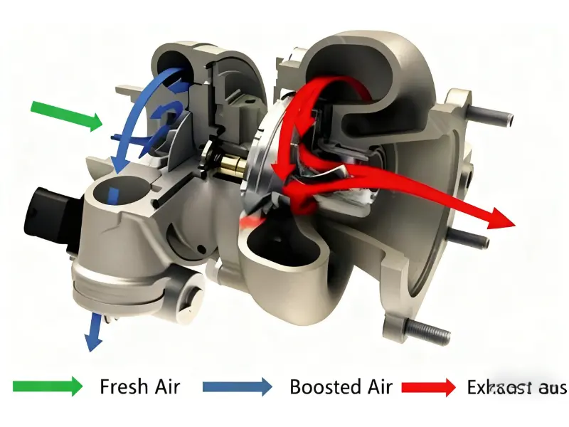 Sawijining turbocharger duwe rong bagian utama: turbin lan kompresor.